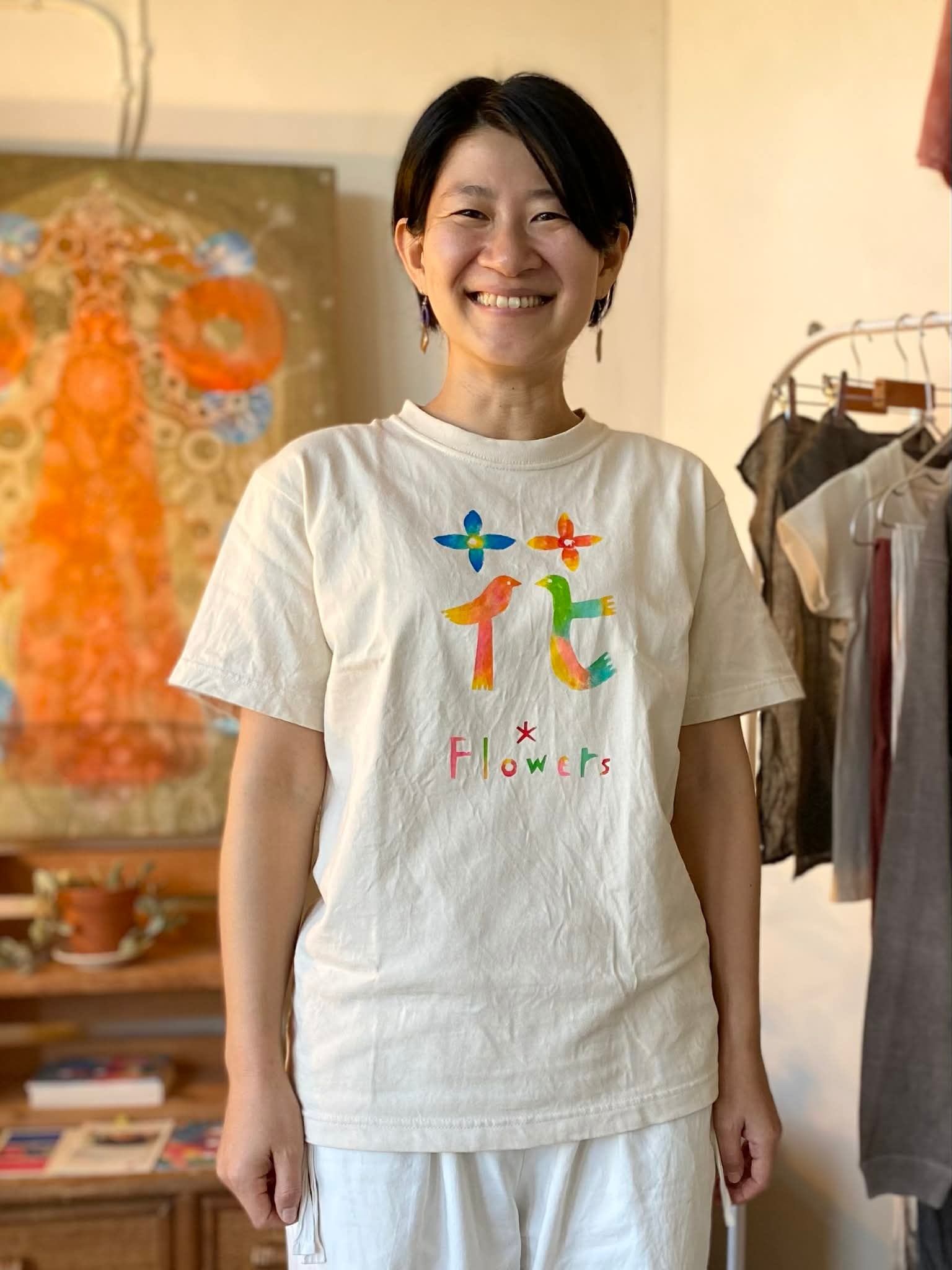 花 Flower 花 / Hana 鳥たちが集まり、花となる。 熊野牛王神符からインスピレーションを得たこの鳥文字は、生命の喜びを形にしたデザインです。一羽一羽の鳥が寄り添い、やがてひとつの花の姿を結ぶ——そんな静かな奇跡を、型染めの手仕事によって布の上に咲かせました。 石垣島の風を纏って、日常の中に小さな祝祭を。 Birds gather, and become a flower. Inspired by the sacred crow-script of Kumano, this Bird Script design captures the quiet joy of life in form. Each bird leans toward another, and together they bloom into a single flower — a small, still miracle brought to cloth through the art of katazome. Wear the winds of Ishigaki, and carry a little celebration into your everyday. マシマタケシがデザインし、型紙を切り、布用絵の後で彩色した手作りのTシャツです。 一枚一枚配色や刷り上がりの表情が違います。 手作業のため、カスレやハミダシはありますが、それはこのTシャツの味とご理解ください。 サイズ(単位:cm) S:身丈66/身幅49/肩幅44/袖丈19 M:身丈70/身幅52/肩幅47/袖丈20 L:身丈74/身幅55/肩幅50/袖丈22 XL:身丈78/身幅58/肩幅53/袖丈24 Tシャツはプリントスター製5.6オンス 少し厚手 オリジナルの紙型で彩色した型染め作品です。 一枚一枚配色や刷り上がりの表情が違います。 洗濯を繰り返しても色落ちはしません。 TORIMOJI – Bird Kanji T-shirt TORIMOJI Bird-shaped Kanji Hand dyed stencil T-shirts Made in Ishigaki Island by Takeshi Mashima T-Shirt Specifications Body: Printstar 5.6 oz T-shirt Slightly thick and durable cotton fabric. Fit: Men’s sizing Size (cm) S — Length 66 / Width 49 / Shoulder 44 / Sleeve 19 M — Length 70 / Width 52 / Shoulder 47 / Sleeve 20 L — Length 74 / Width 55 / Shoulder 50 / Sleeve 22 XL — Length 78 / Width 58 / Shoulder 53 / Sleeve 24