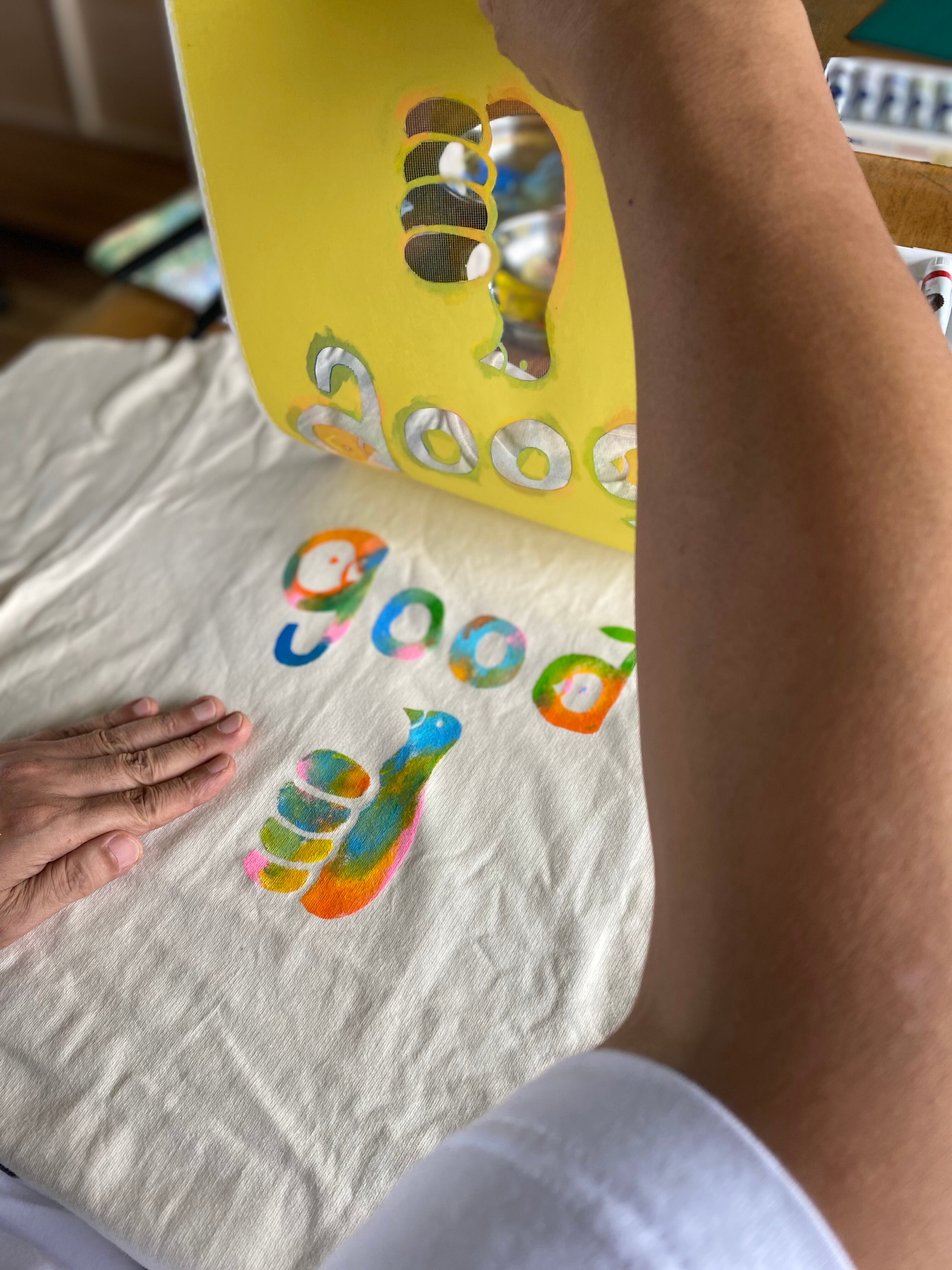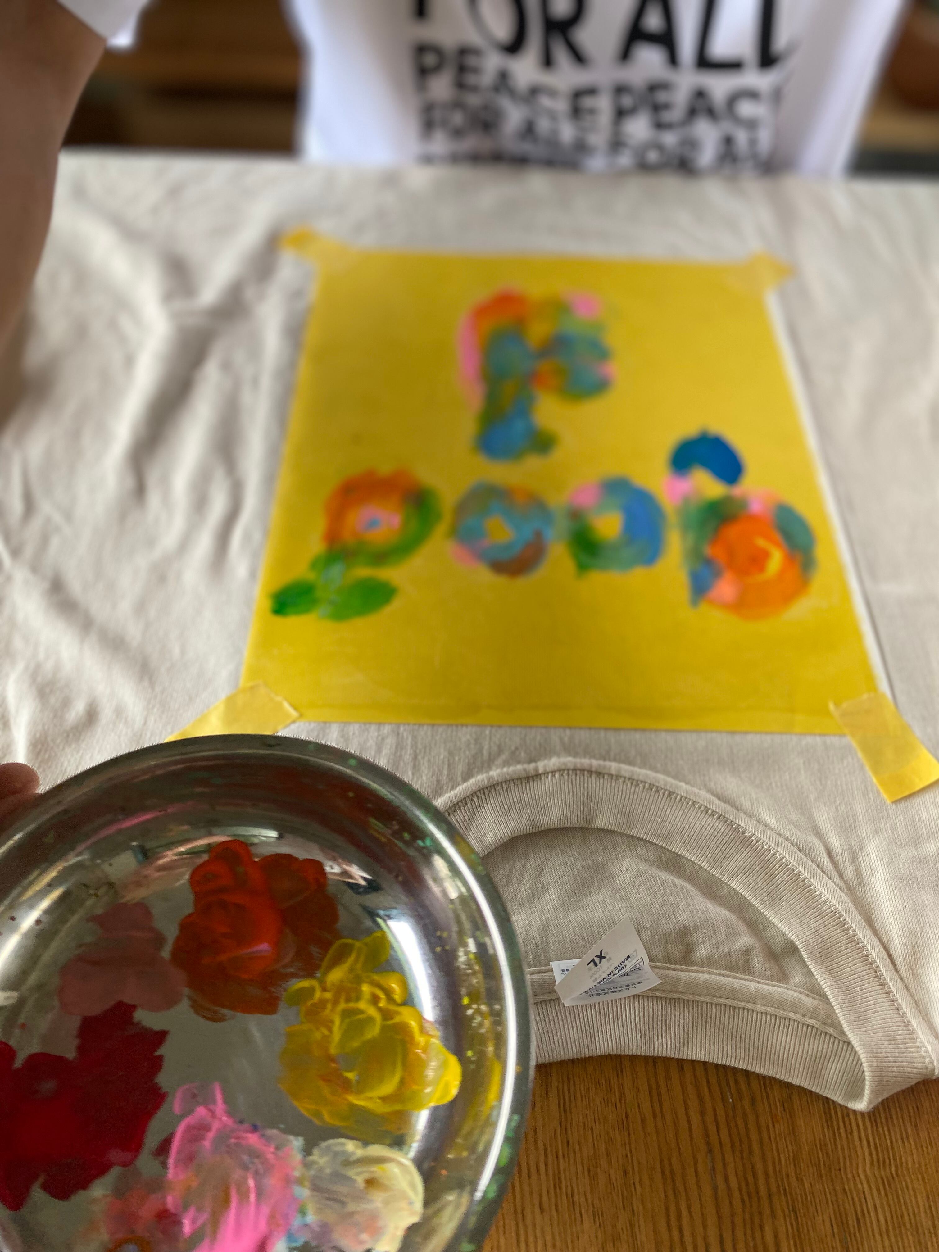 マシマタケシがデザインし、型紙を切り、布用絵の後で彩色した手作りのTシャツです。