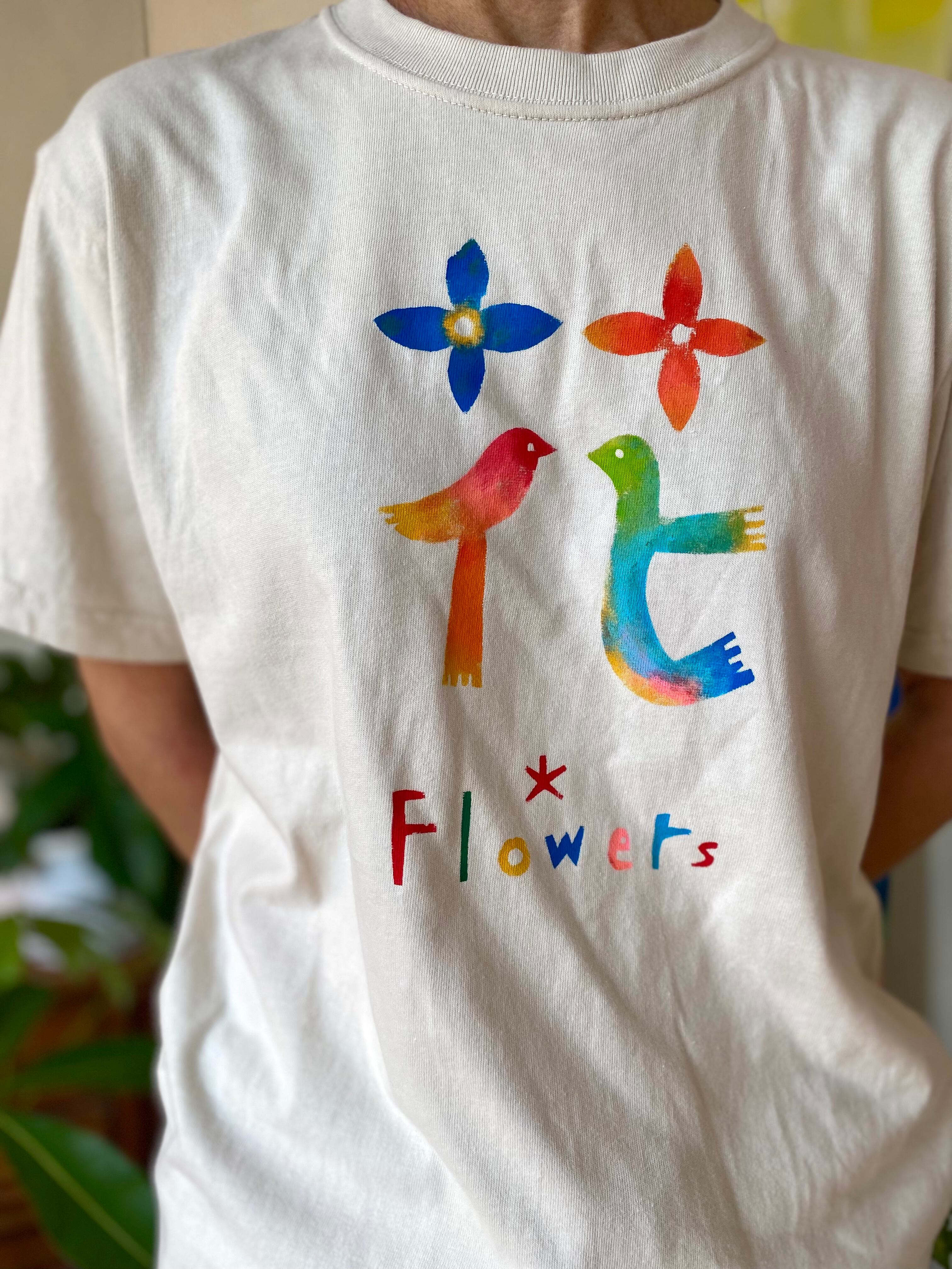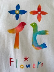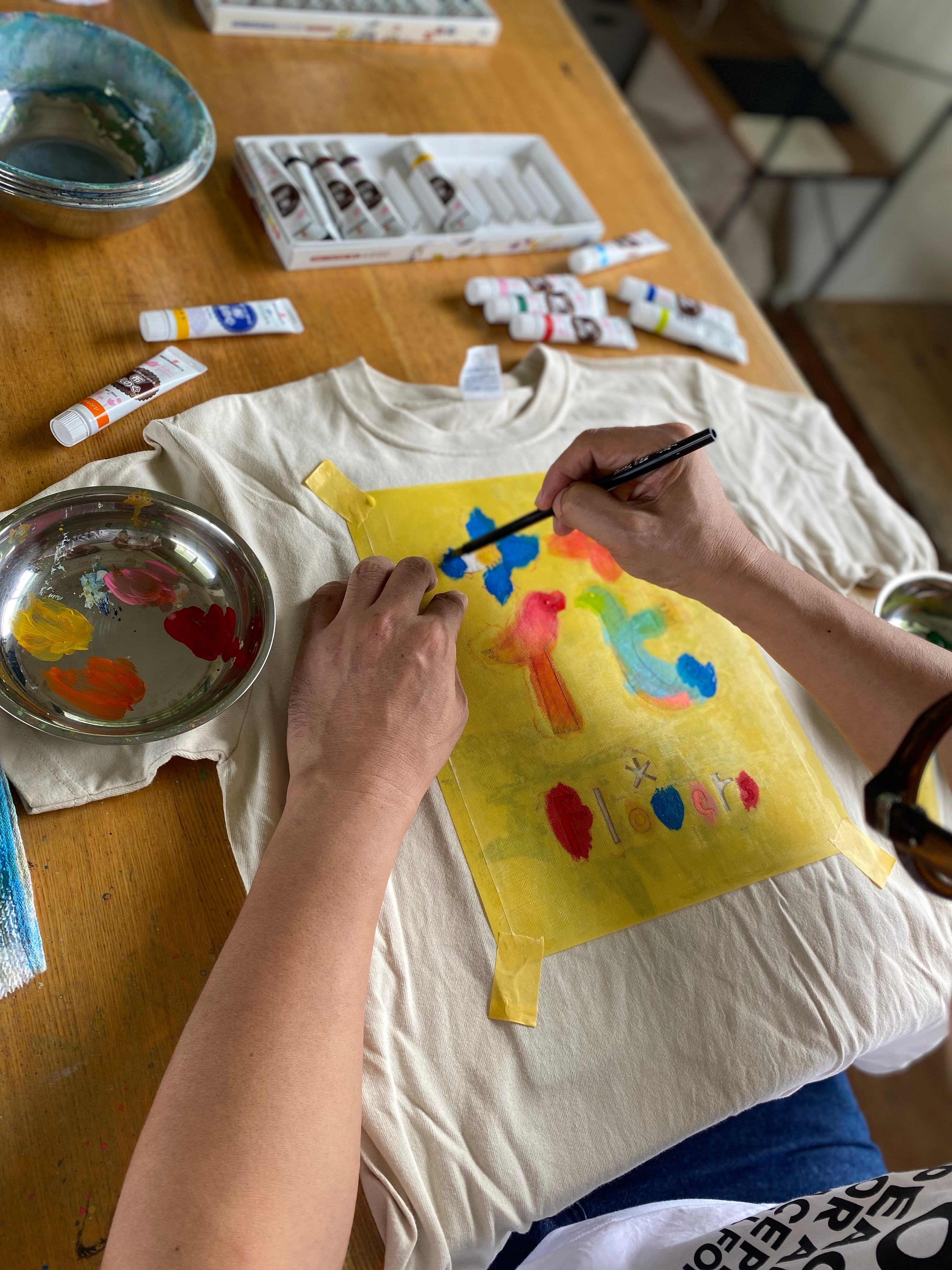 マシマタケシがデザインし、型紙を切り、布用絵の後で彩色した手作りのTシャツです。