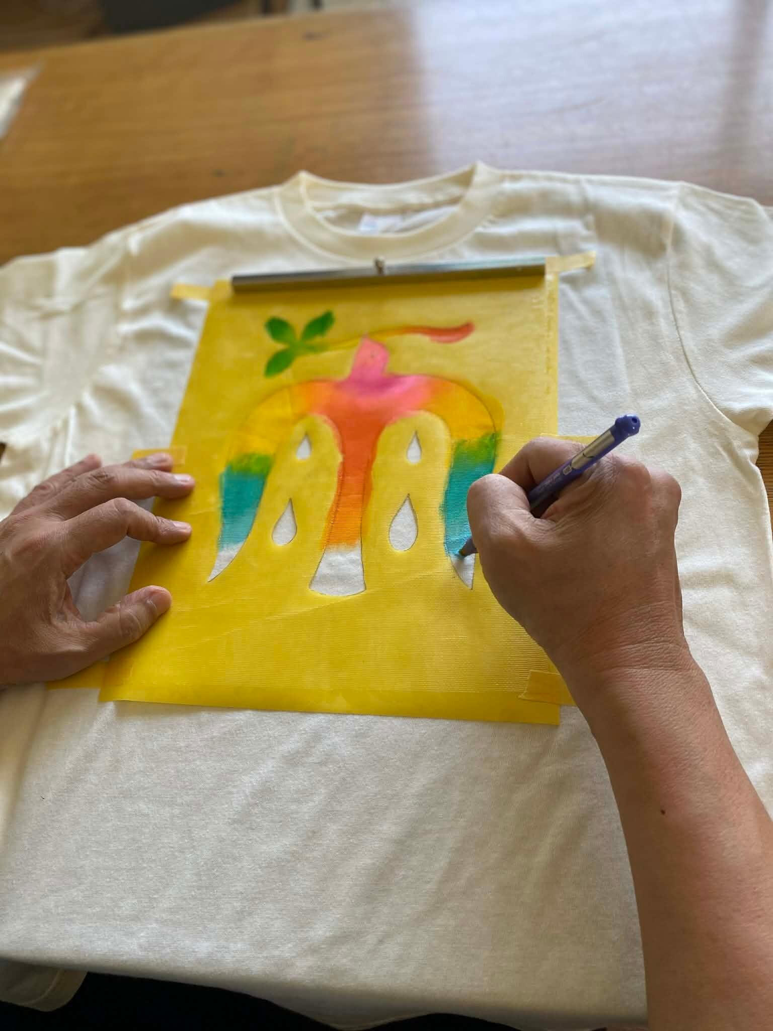 マシマタケシがデザインし、型紙を切り、布用絵の後で彩色した手作りのTシャツです。