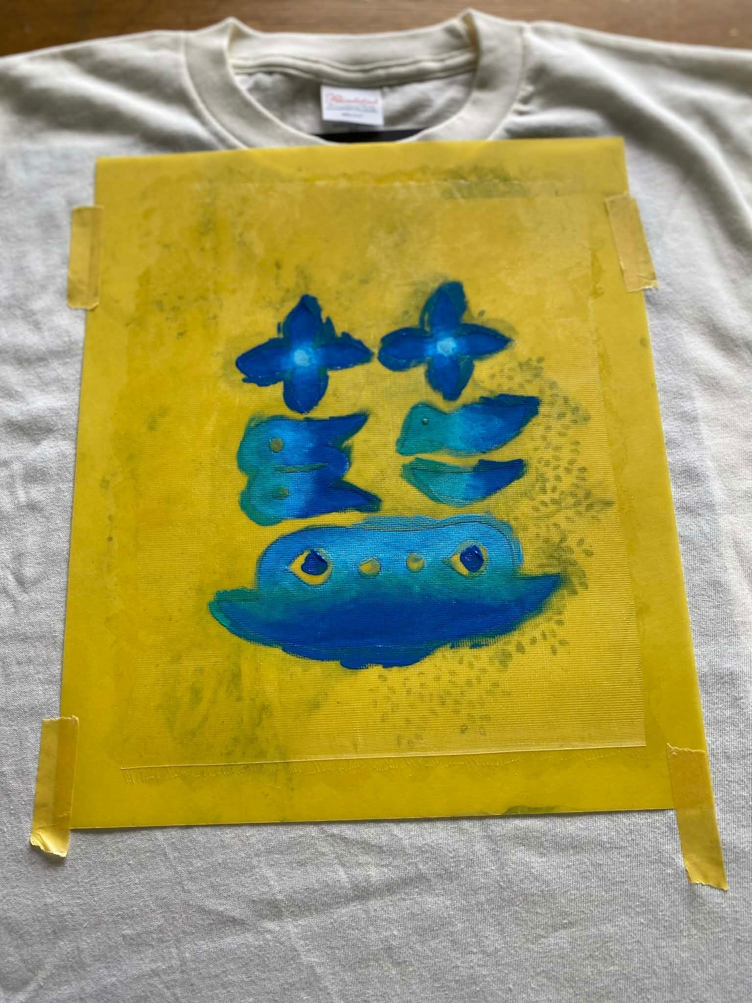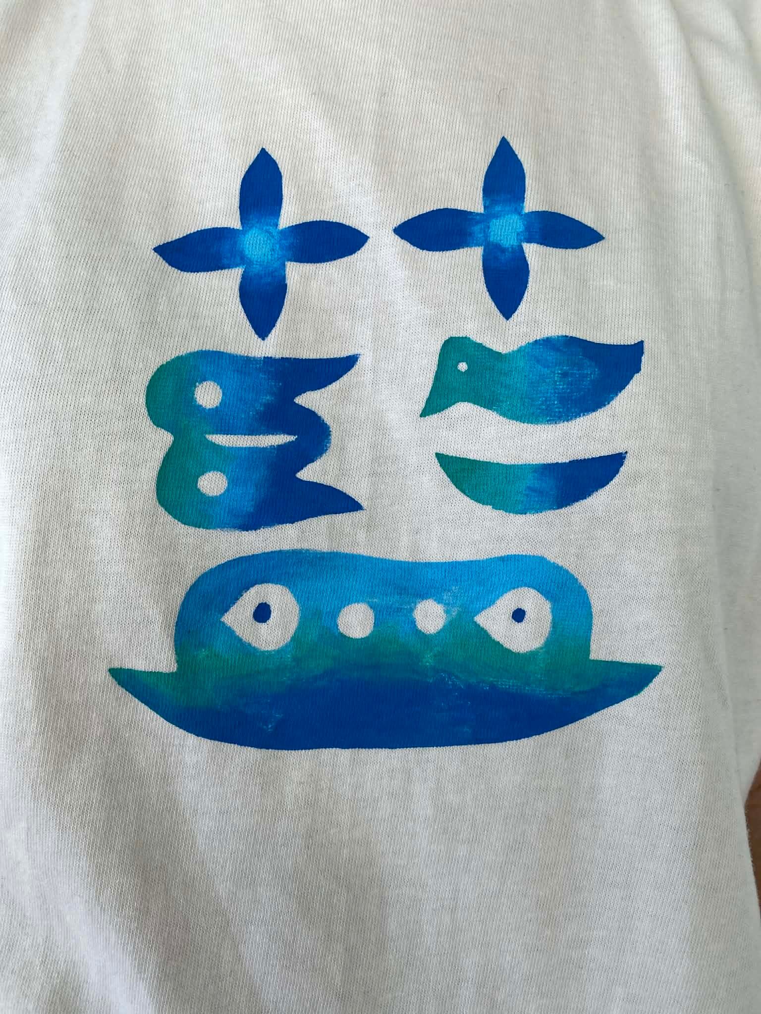 マシマタケシがデザインし、型紙を切り、布用絵の後で彩色した手作りのTシャツです。